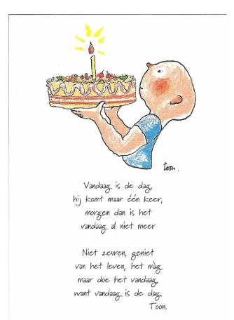 Vandaag is de dag, hij komt maar één keer, morgen dan is het vandaag al niet meer, niet zeuren, geniet van het leven, het màg, maar doe het vandaag, want vandaag is de dag,