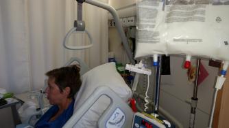 Joke de Spacecake, de tripper. Echt waar, ze was zowat aan het trippen. Ze zag en hoorde dingen. Zelf had ik weleens de gedachte gehad dat ze soms ijlde. Dat weet ik dan aan haar koorts, maar 38.8 max is niet zo dat je ervan gaat ijlen. Elke keer vroeg ze of er niet een straatfeest of een festival was. Hoe ik ook mijn best deed, ik hoorde niks. Ze hoorde van alles, vooral muziek die niet eens haar derde keus zou zijn. Ook zag ze in een vrolijke poster tegenover haar bed van een citroen plantage, allerlei enge koppen die haar aanstaarden. Nou, dat laatste kan ik me in het donker best voorstellen, maar die muziek? De poster is in ieder geval verwijderd. Het was zelfs zo, dat toen ik het raam opende om het tegendeel te bewijzen, ze de muziek echt luider hoorde.Dat gebeurt niet zomaar. Ze heeft al 8 dagen niets gegeten. Spoog liters per dag. Haar reserves zijn op, waarbij ze ook nog een ernstig kaliumtekort heeft. Vraag me niet het hoe en wat, maar dat ze zo tript heeft daar mee te maken. Dat kwartje viel vanmiddag pas bij mij, toen Joke me het uitlegde. De gevolgen van zo’n tekort zijn legio, en allemaal even ernstig.Sinds gistermiddag is ze op rantsoen gezet. Ze mag alles drinken, ook in de vorm van een ijsje, maar niet meer als een halve liter. Dat had meteen resultaat. Haar maag kreeg rust, ze spoog nog slechts mondslijm. Vieze, taaie slijm. Echt spugen was nog sporadisch. Maar nu moet ze nog eten. Dat gaat sinds vanmiddag via een slangetje en een pomp. Maar niet meer via een maagsonde. Dan zou alles weer van voor af aan beginnen. Ze hebben nu een infuus in een grote ader geprikt, onder haar sleutelbeen. Dat gebeurde in de voorbereidingskamer van de OK, want het moet steriel gebeuren. Volgens mij heeft Joke nog nooit zo duur en zo smakeloos gedineerd. Ze eet astronautenvoedsel.Wat is er niet veranderd? De rest. Ze is nog slapper, koorts is er nog, Hb gezakt naar 5.5, heeft geen puf om zelf te bloggen en heeft verschrikkelijk heimwee. Slapen is ook nog steeds fantastisch goed slecht. Als ze dan slaapt, gaat het alarm bij de buurvrouw of bij haar eigen pomp net zo tekeer als het getingeltangel bij mij van de carillons. Op de foto is Joke met een soort blaas apparaat een oefening aan het doen, welke ze van de fysiotherapeut kreeg.