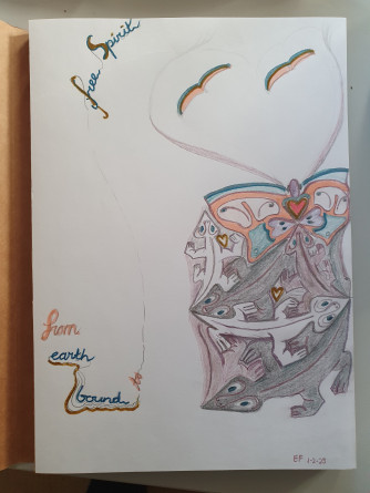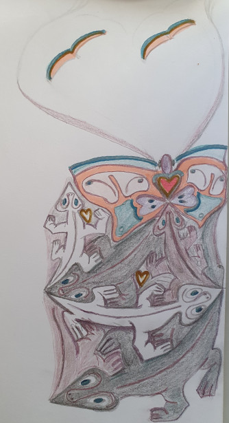 Ken je Escher? Hij maakte o.a. tekeningen waarbij hij bv van een vogel overgaat naar een vis. Ik hou van tekenen en besloot de enge salamanders op papier (én in mijn beleving) om te vormen tot vlinder. Het bracht me rust, ruimte om de volgende stap te zetten in mijn genezingsproces (ik noem t bewust niet ziekteproces).