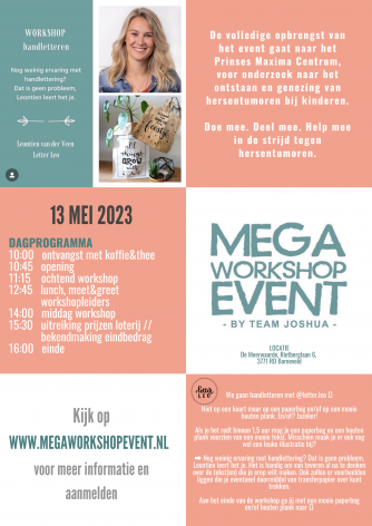 De impact van deze ziekte is zo groot. Eunice en Regina beseften nog meer hoe belangrijk onderzoek nodig is naar het ontstaan en genezing van hersentumoren. Begin 2017 zaten ze samen in het Ronald Mc Donaldhuis in Nijmegen. Joshua was langdurig opgenomen en om de tijd door te komen gingen ze maar eens handletteren. Ze dachten dit wel even te doen maar dat viel reuze tegen ; ) Het idee om een workshop te gaan organiseren om geld in te zamelen is voor het goede doel is daar ontstaan. In eerste instantie wilden ze het Mega Workshop Event klein houden maar uiteindelijk werd het een event met meerdere workshops voor 100 mensen. Het eerste MegaWorkshopEvent in 2017 werd een groot succes en heeft Eunice en Regina geïnspireerd om door te gaan en nog groter te denken.