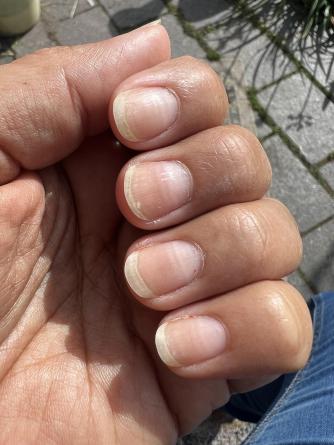 Het tweede meest duidelijke defect zijn mijn handnagels. Groeien doen ze gelukkig nog steeds maar ik zie duidelijk de verandering in nagelplaat structuur en kleur. Dat hersteld zich gelukkig ook weer allemaal en uiteindelijk hoe belangrijk is dat nou helemaal!? Nou ja eigenlijk voor mij wel heel belangrijk, natuurlijke beroepsdeformatie zeg maar.