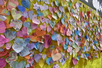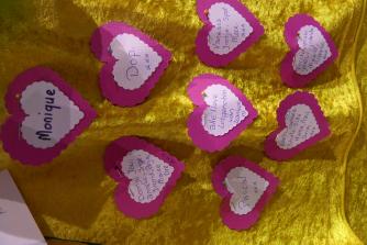 Gaandeweg de week kwam de wand met hartjes en sterretjes steeds voller te hangen.Tijdens de saamhorigheidsviering werd een compilatie hiervan getoond. De tranen stonden in mijn ogen toen de 2 harten en 2 sterren voor mezelf, mijn broer en zussen en mijn vader werden getoond. Maar ook voor jullie allemaal heb ik hartjes opgehangen en heeft op 1 juni een kaars voor jullie gebrand op de berg.