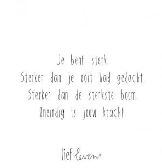 Ik ben aangekomen in het laatste stukje van mijn leven en jij staat met je 18 jaar aan het begin. Het doet verdomd veel pijn om jou in dit laatste stuk te moeten missen...jij niet meer dagelijks om mij heen...je nu al te moeten loslaten. Alles wat de kanker heeft afgepakt valt in het niet bij dit gegeven. Wat gun ik jou dat de scherpe randen worden weggenomen en jouw ziekte draagbaar wordt. Schaam je er nooit voor en voel je nooit schuldig, wordt weer gelukkig en blijf vechten voor je leven, ik geloof in jou!