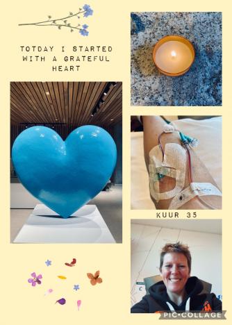 Vijf weken terug mocht ik mij weer voor kuur 35 melden in het Roudboud. Mijn waarden waren binnen de gestelde normen en met een dankbaar gevoel ging ik naar het ziekenhuis. Deze keer overheerste het gevoel dat ik blij was weer een dosis van de Bevacizumab te mogen krijgen, dus dan is zo’n dag altijd beter te doen, als dat het gevoel van tegenzin, frustratie en verdriet de boventoon voert. Op dit soort dagen ben ik me altijd extra bewust van mijn mentale gesteldheid. Zijn het helpende of niet helpende gedachten die die dag aanwezig zijn om ervoor te zorgen dat ik dit soort momenten zo goed mogelijk door kan komen. Gelukkig was het een dag met veel positiviteit in mijn koppie, aanmoedigende en lieve berichtjes, vriendelijke verpleegkundigen, een rustige afdeling, vrolijke taxichauffeur en een dikke knuffel bij thuiskomst van Bas. Allemaal zaken die op zo’n dag ervoor zorgen dat alles toch een stuk beter te doen is.