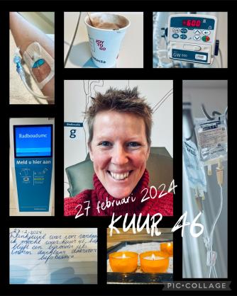 Na een onrustige nacht wordt ik om 05:15 wakker. Bas maakt zich klaar om naar zijn werk te gaan en ik probeer nog even een uurtje slaap mee te pakken, maar helaas lukt dat niet meer. De onrust voor een nieuwe kuurdag zit er ongemerkt toch weer in. Je zou denken dat dat na 45 keer alles misschien toch wel een beetje went, maar het tegendeel is waar. Op de een of andere manier hikt mijn lijf er altijd een beetje tegenaan. Na een aantal keer draaien besluit ik er dan toch maar vast uit te gaan. Om 8 uur komt de taxi voor rijden. Iedere keer ben ik benieuwd welke chauffeur mij op komt halen. In de afgelopen jaren heb ik al veel verschillende chauffeurs voorbij zien komen en natuurlijk heb ik ook zo mijn favorieten. Wanneer ik een auto met een blauwe kentekenplaat voor zie rijden die ik niet meteen herken, maakt na het zien van Wim die uit de auto stapt, mijn hart een sprongetje van vreugde. Ik weet meteen dat het een gezellige rit gaat worden aangezien dit een van mijn favoriete chauffeurs is. We hebben elkaar ruim 8 maanden niet gezien, dus er valt een hoop bij te kletsen. Na een warm welkom in de nieuwe taxi, wordt er dus voluit gekletst. Dat er wat file staat en we later aankomen dan gepland, is totaal niet erg. De tijd vliegt voorbij en in het Radboud aangekomen haast ik mij naar boven naar de dagbehandeling van de oncologie.