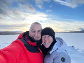 De wandeling door de diepe sneeuw was ook een van de hoogtepunten. Afgelopen zomer hadden we een nachtje doorgebracht in een hangmat aan een bergmeertje. Ik was benieuwd hoe het er in dit seizoen uit zou zien, dus gingen we op pad. In het begin was het nog redelijk te doen. Brodders onder mijn schoenen tegen het uitglijden en je voeten bij iedere stap flink optillen in de sneeuw. Op een gegeven moment kwamen we op een stuk waar de afgelopen dagen duidelijk niemand meer had gelopen. Op wat rendier-, herten- en konijnensporen na was de sneeuw onaangeroerd en zo’n 40 cm diep. Finn liep tot aan zijn buik in de sneeuw en af en toe verloor ik mijn evenwicht en lag ernaast. Gelukkig liep ik het meeste deel achteraan, maar soms moest ik zo hard lachen dat mijn onhandigheid toch niet onopgemerkt bleef. Het heeft in ieder geval komische opnames opgeleverd die ik dan aan het maken was met mijn GoPro. Het meertje lag er ook in dit jaargetijde prachtig bij en na een korte stop met een kop warme thee vervolgden we de route en kwamen we na een aantal uur lopen weer thuis. Daar aangekomen stond de bålpanne buiten te branden en konden we bijkomen van onze tocht bij het warme vuur met warme chocolademelk en pulser(worst) in een lefse (soort wrap).