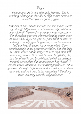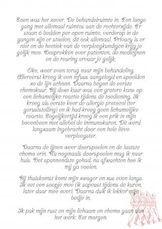 In de afbeeldingen kunnen jullie mijn blog vinden over de eerste dag van mijn kuur. (druk op lees verder :))Mijn beleving van het ziekenhuis, wat er allemaal op mij afkwam en hoe ik mij daarna voelde.