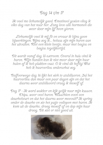 Hierbij deel ik met jullie dag 14 tot en met 17 van de kuur. Vandaag praat ik over mijn haarverlies. Je kunt mijn blog vinden in de afbeelding (druk op lees verder).