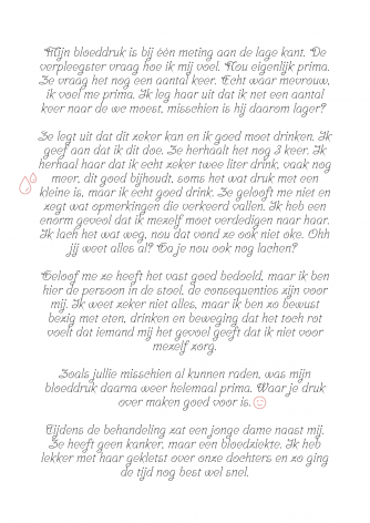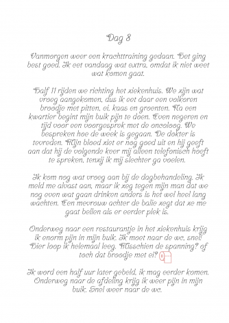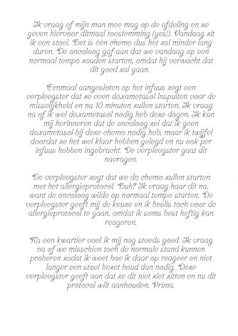 Hierbij deel ik met jullie dag acht van de kuur. Je kunt mijn blog vinden in de afbeelding (druk op lees verder). Vandaag is het weer chemo dag. Ditmaal geen immuno en ook geen Carboplatin. Gelukkig ´maar´ 1 chemo vandaag en dan zit 1 gehele kuur erin.