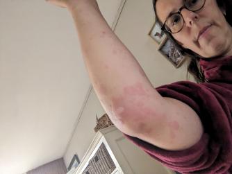 Gisterenmiddag om een uur of 4 zaten er ineens een paar bultjes naast elkaar. Ik dacht eerst nog dat het muggenbeten waren, maar het werd al snel meer. 's Avonds nog een beetje televisie gekeken en het werd steeds heftiger.