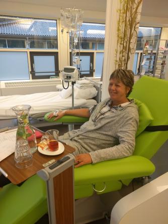 Afijn, het prikken was weer een drama dus toch weer infuus op de hand. Eerst de Trastumab en daarna spoelen en de medicatie voor de Paclitaxel. Ik viel dus NIET in slaap. Tussendoor een soepje en een broodje gegeten en naar muziek en luisterboek geluisterd. Ik zat heerlijk in een comfortabele stoel en ook mijn man zat lekker met zijn laptopje bij het raam. Tussendoor moest ik veel naar de toilet. Dus steeds met infuuspaal aan de wandel. Ik dronk veel water en ook de thee en soep waren hier debet aan. Naast mij zaten dames met zo'n ijskap om hun haar te beschermen. Dapper hoor maar niets voor mij zo'n koud hoofd. Echt lekker voelden ze zich niet en eerlijk gezegd vond ik de kale plekken en de doffe kleur van hun haar ook niet mooi. Dan maar kaal, kom ik ook wel weer overheen. Gelukkig geen allergische reacties dus om half 3 lekker weer naar huis. Volgende week gaat het sneller omdat ik geen directe allergische reacties heb. Wel heb ik volgende week eerst een afspraak met de mammacare verpleegkundige.