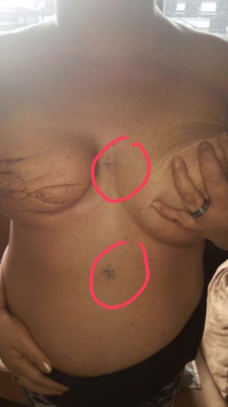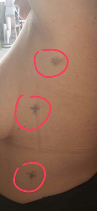 Toen liep ik een week lang met eerst kruizen en stipjes op mijn lijf, en later met alleen nog de stipjes op mijn lijf rond. 2 aan mijn rechterzij, 2 aan mijn linkerzij, 2 tussen mijn borsten en 2 onder mijn rechteroksel ergens. Door het douchen gingen die kruizen er gemakkelijk af. Ik vroeg mij af of ze die stipjes wel weer zouden gaan vinden omdat ze tussen mijn moedervlekken verstopt zaten....
