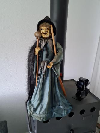 En nu wil ik graag geloven dat ze in het restaurant 'De Heksenketel' heeft gehangen... En waarom ook niet... Voor de foto heb ik haar op de houtkachel gezet, maar ze staat nu op de oven. De boel wat in de gaten houden 😉.