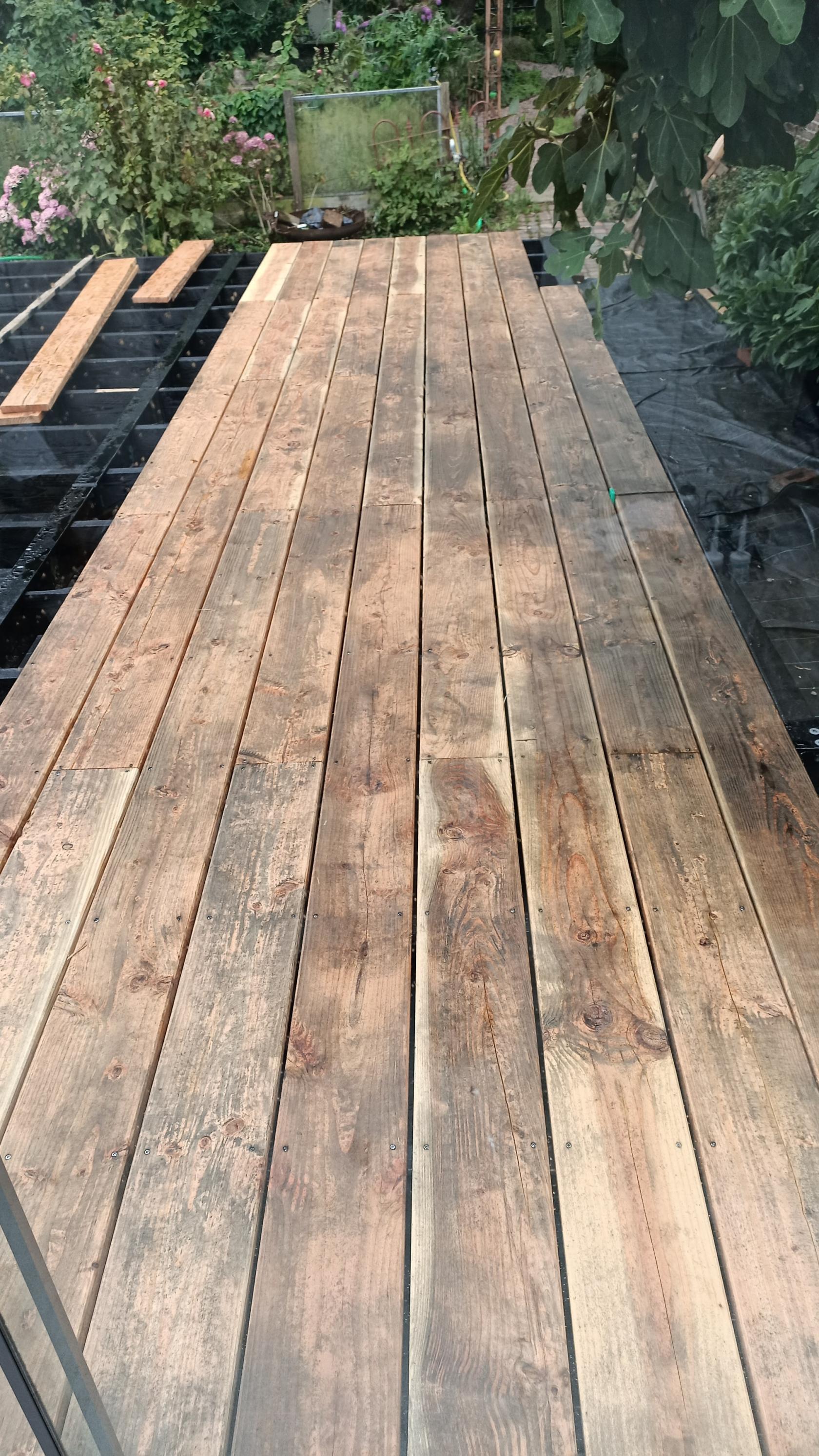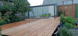 De serre staat, nog wat afwerking moet er gebeuren. De tegels voor de vloer en wand zijn besteld, de tegelzetter heeft er alle zin in. Nu bezig met het terras. Ik heb voor douglas hout gekozen, wat een stuk voordeliger is dan hardhout. Onbehandeld gaat het 15 jaar mee, dan is mevrouw Zweef bijna 80. Desalniettemin heb ik het hout toch voorzien van een olie, uv bestendig, dus de kleur zou zo oranje moeten blijven. Volgens de verpakking zou één laag voldoende zijn. Helaas, dat blijkt niet zo te zijn. Ongeveer een kwart van het terras verkleurde na de eerste forse regenbui in donkergrijs, tegen zwart aan.