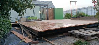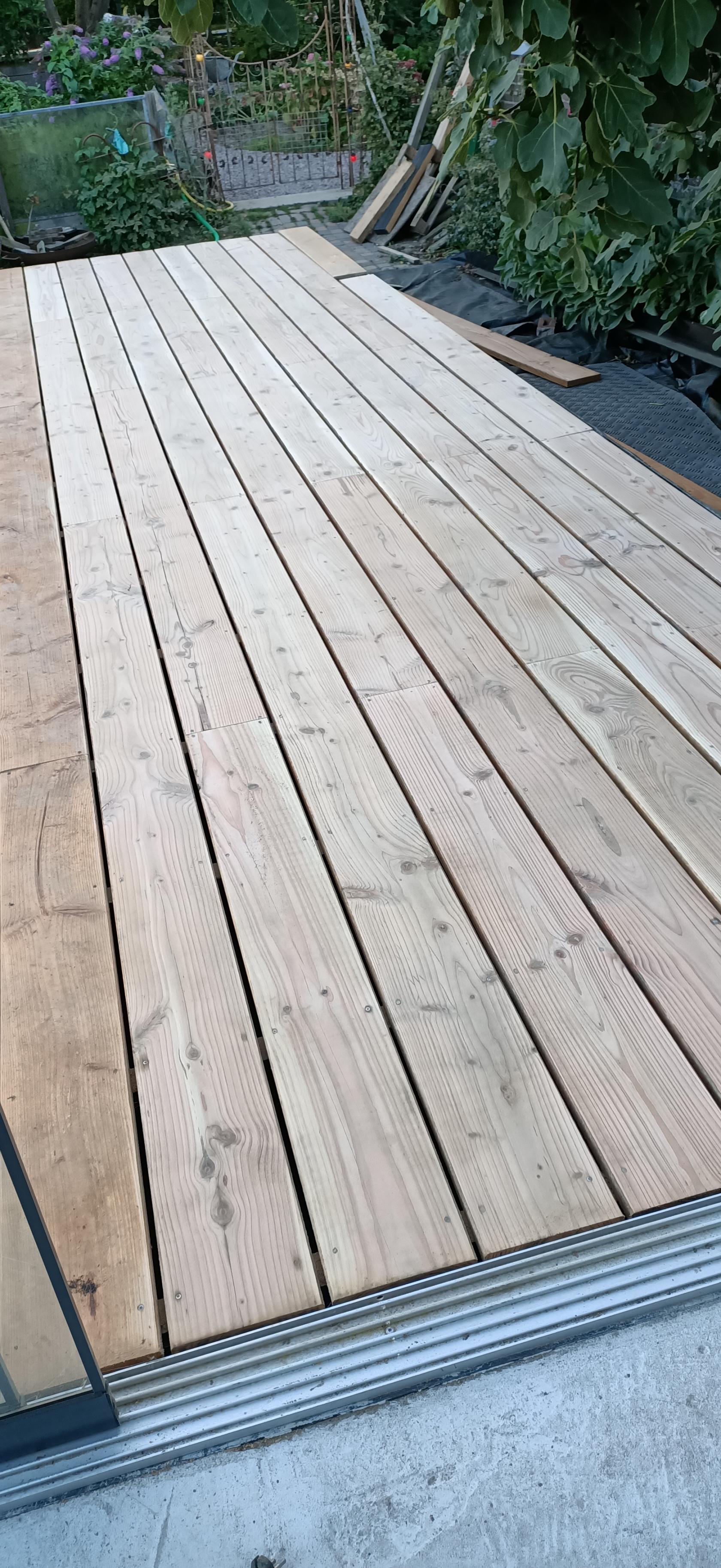 Ziet er goed uit Zweef en douglas hout is een goede keuze waar je zeker veel plezier van zult hebben. Nu alweer ruim 15 jaar geleden zelf een terras van douglas vlonderplanken gemaakt in Hongarije en eerst ook 2x in de olie gezet. Achteraf heb ik daar wel wat spijt van gehad er treden naar verloop van tijd toch kleurverschillen op. Douglas verkleurt van zichzelf naar mooi grijs en ik heb er nooit meer iets aan gedaan. Toen wij 2 jaar geleden verhuisden zag het er nog steeds goed uit het is een dankbare houtsoort.