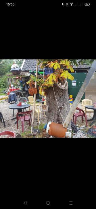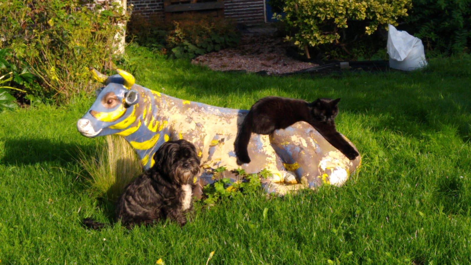 Niks probleem. Op het terras zat een lokale schipper die hem al aardig had zitten, niet van de koffie, maar van de illegale neut. Hey Leo! Geef die mensen van mij effies een bak koffie en doe er ook een punt appeltaart bij. Mét slagroom! En zo kwam het dat we geruime tijd gesproken hebben met die beste schipper aan wal en de sluiswachter. En de sluiswachter had een kerststal in zijn huis staan, levensgroot. Zijn vrouw was daar minder van gecharmeerd en bonjourde de handel naar buiten. Leo had geen probleem om de ezel en kindeke Jezus op te doeken, maar voor de os had hij een zwak. Vooral nadat een plaatselijke kunstenares de os had beschilderd in lila met gele bananen, waarbij er twee als hoorns op de ossekop stonden. Mevrouw Zweef zag de os en zei dat Zweef een moorkop in zijn tuin had staan. Ooooohh!! Een moorkop kreet sluiswachter Leo uit. Die heb ik al zolang willen hebben. De deal was gauw gemaakt, we zouden voor een jaartje ruilen. Leo heeft de moorkop nu op het dakje van zijn schenkerij staan. Hij heeft een rode voetbal als kers erbovenop geplakt. En bella vertrok naar de grazige weiden van Andijk. Nu met de storm ligt ze binnen in het boetje, want we willen niet dat er Andijkers worden geraakt door rondvliegende lila met bananen ossen.