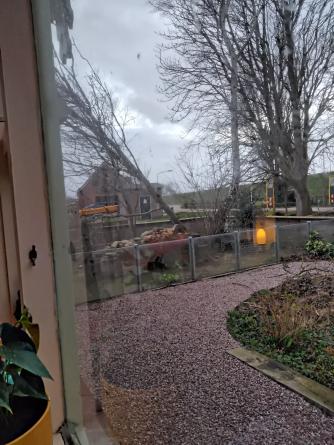 De storm begint al toe te nemen, lief heeft een rondje rondom huis gelopen om alles wat los ligt of los zou gaan kunnen liggen vast te leggen of binnen te halen. Zo ook Bella.