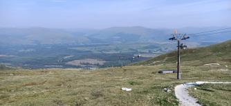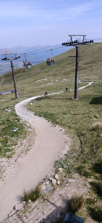 Nou kun je een berg oplopen en er zijn er hier zat die dat "eventjes" doen, maar dat is voor mij nog niet weggelegd. Misschien ooit nog eens. Er ging ook een gondellift. En ik ben geen fan van die dingen. Niet zo erg als stoeltjesliften, maar toch...liever niet. Maar mevrouw Zweef wilde zo graag, dus ik heb mijn afkeer bedwongen en haar hand tot moes geknepen. Ogen dicht helpt! We waren vroeg, dus de gondelvaart ging voorspoedig. Boven op de berg genoten van het uitzicht, een wandeling naar een nog hogere top en de waaghalzen op de fiets uitgezwaaid. Kanonne, wat gaat dat hard! Hele stukken berg sloegen ze over.