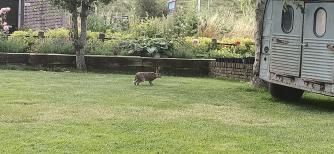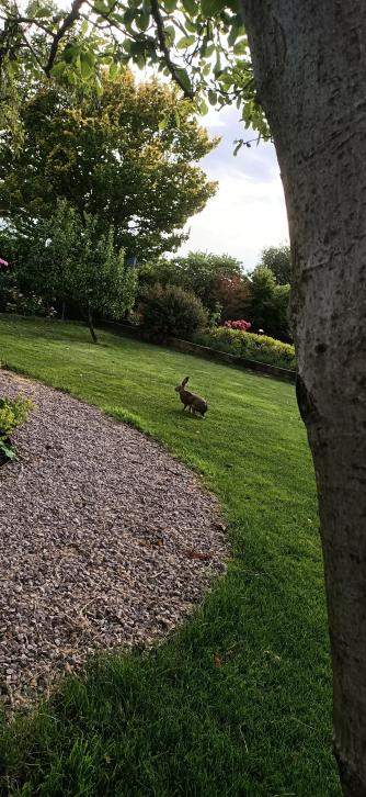 En nou zat ik onder de walnotenboom, mijn oranje tuinbroek aan, dus niet helemaal incognito, maar in ene zie ik een haas in mijn ooghoek aan de andere kant van de walnotenboom. Onderzoekend naar mij kijken en naar de eend.