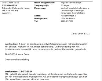 Ja, of zoiets. Huisarts heeft gebeld en verwijsbrief gemaakt voor dermatologie van het Dijklander. Toegangstijd 70 dagen stond er op het automatisch gegenereerde document. Dat gaan we dus niet doen hè! U hoeft zelf geen contact op te nemen, wij bellen u.