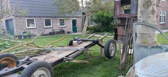Eigenwijs als ik ben heb ik zelf het huisje van het chassis gerold en drie paaltjes in de grond gejast. In etappes, tussendoor hijgend als een stoompaard mijn rust gezocht op de tuinmuur. Met een krik het chassis op de paaltjes gezet en vastgeschroefd. Buurman heeft nog even geholpen om het hutje weer op het chassis te schuiven. Vandaag de losse onderdelen weer gemonteerd.