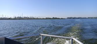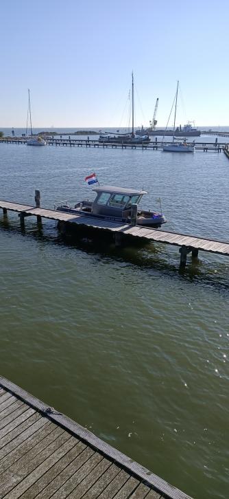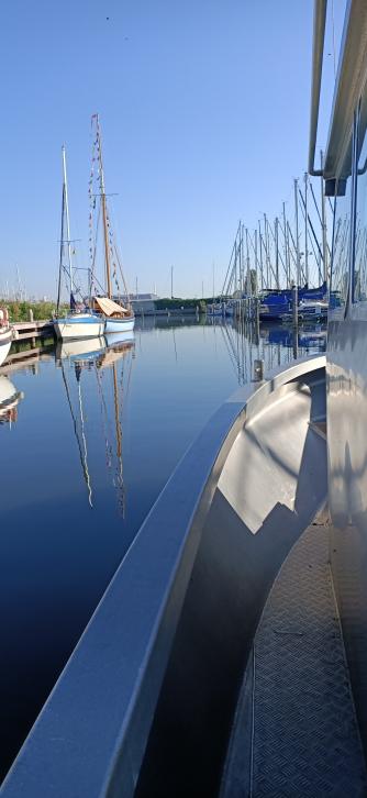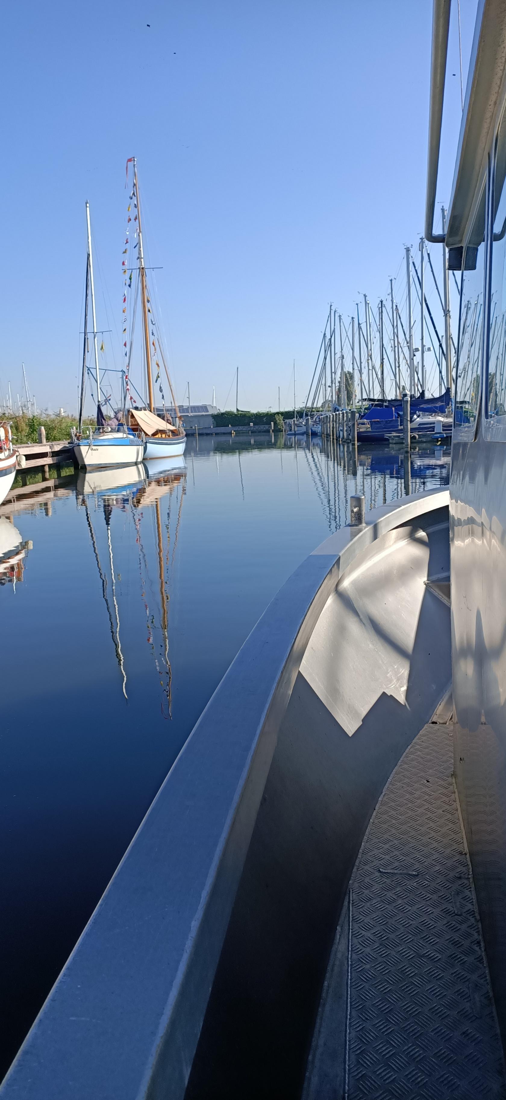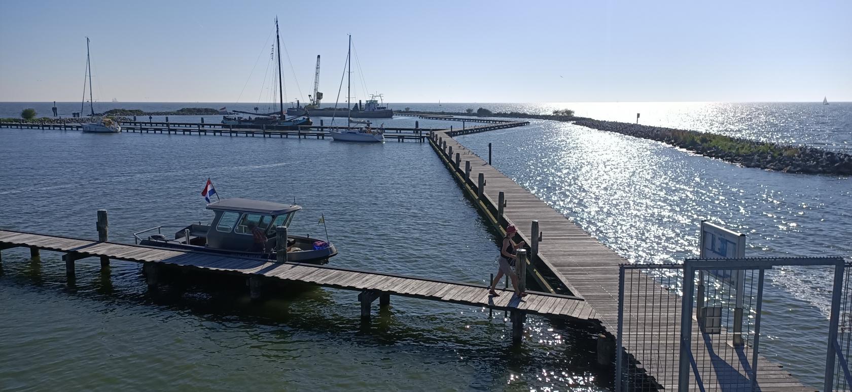 We waren op uitnodiging meegevaren met de watertaxi Heen en Weer van jachthaven De Kreupel. En die ligt gewoon voor mijn huis, aan de andere kant van de dijk. Dus aan de waterkantkant. Buren een eindje verderop zijn actief lid van de vereniging en hij is dus de watertaxischipper. We gingen een gast ophalen die twee weken het havenmeesterkwartier had bevrouwd. Twee weken verstoken van bijna alles.