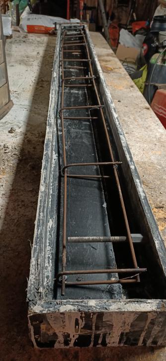 De dorpel voor het kozijn in de herkansing. Ik heb de gelegenheid te baat genomen om nu maar een echte wapeningskorf in elkaar te lassen. Mevrouw Zweef heeft met de zakken mortel gesjouwd, ik mag wel oppassen, straks is zij de sterkste hier in huis.
