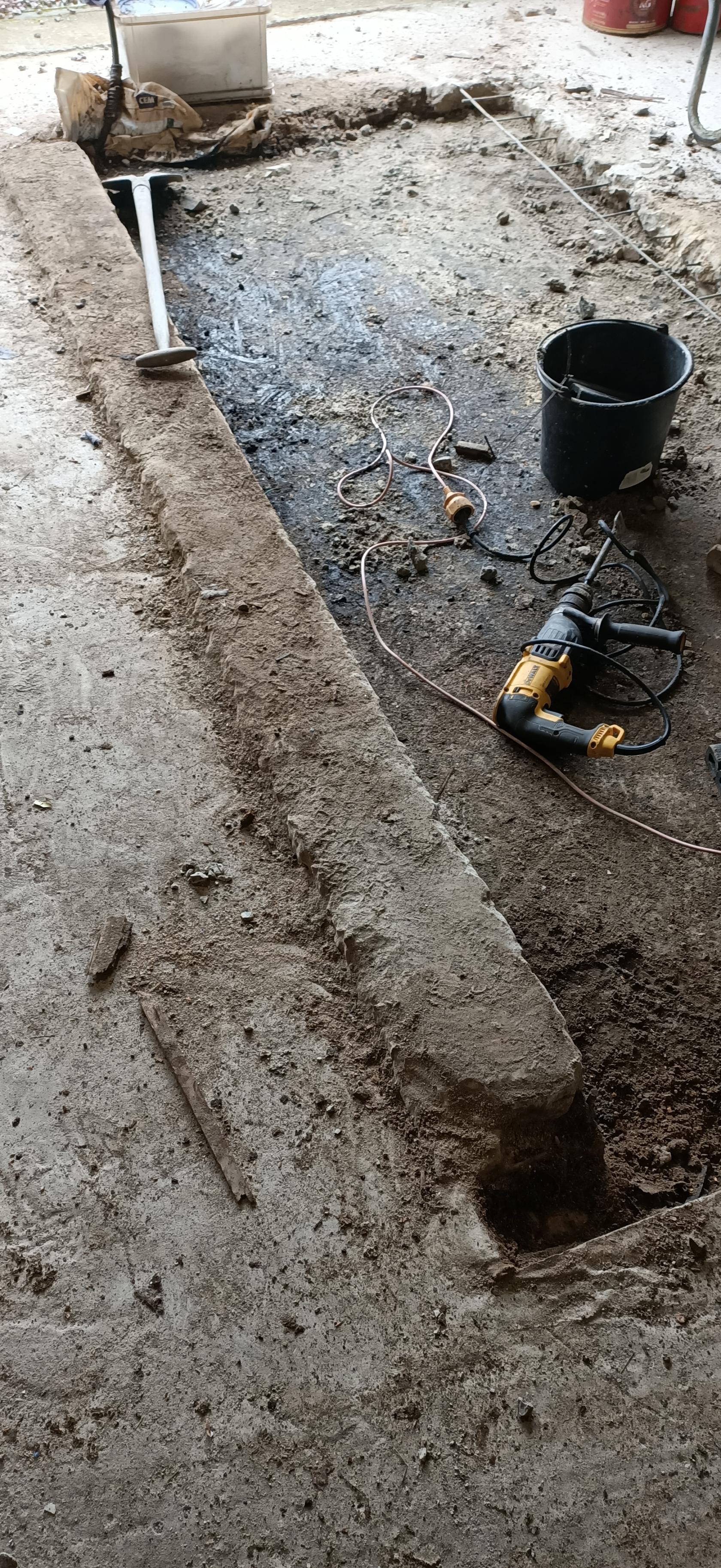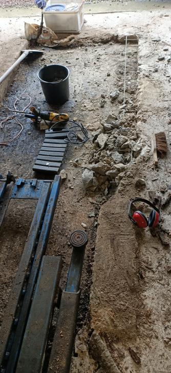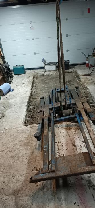 In mijn vorige blog heb ik de hefbrug onder de tafel op het droge gehesen en de cilinder gedemonteerd. Die ligt nu bij vriend H om te reviseren. Ondertussen kan ik de vloer prepareren. De hefbrug ligt weer op zijn plaats en is op hoogte gesteld. Het is een loeizwaar ding, maar met het takeltje lukt het wel. De randen oude beton zijn weggehakt en het puin ligt op de aanhanger. Mijn workout voor vandaag weer gehad.