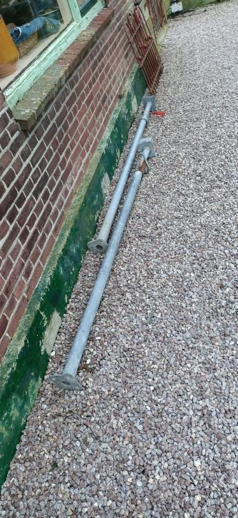 Ik laat ze mooi zitten, dat voorraam moet er toch een keer uit. En het nieuwe raam staat al bij de leverancier. Stempels geregeld bij de buurman, één van de stempels aangepast door de lip eraf te slijpen en vlak er weer aan te lassen, zodat ik die mooi in het metselwerk kan schuiven om de gevel te ondersteunen. Steiger opgebouwd, dinsdag komt broer weer.
