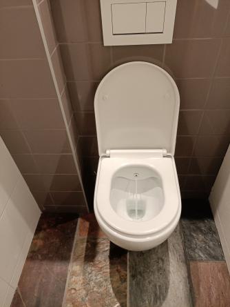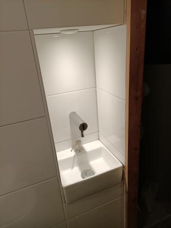 Maar het gastentoilet is nu klaar, de straal nog koud omdat de warmwateraansluiting nog niet is aangesloten, maar het poepertje is schoon. Wel koud.