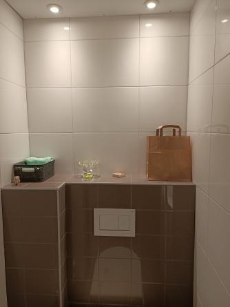 Inmiddels de halve badkamer gesloopt en daar moet een vergelijkbare wc komen, maar die blaast hem ook nog droog met warme lucht. Strakke planning, over twee weken komt de tegelzetter.