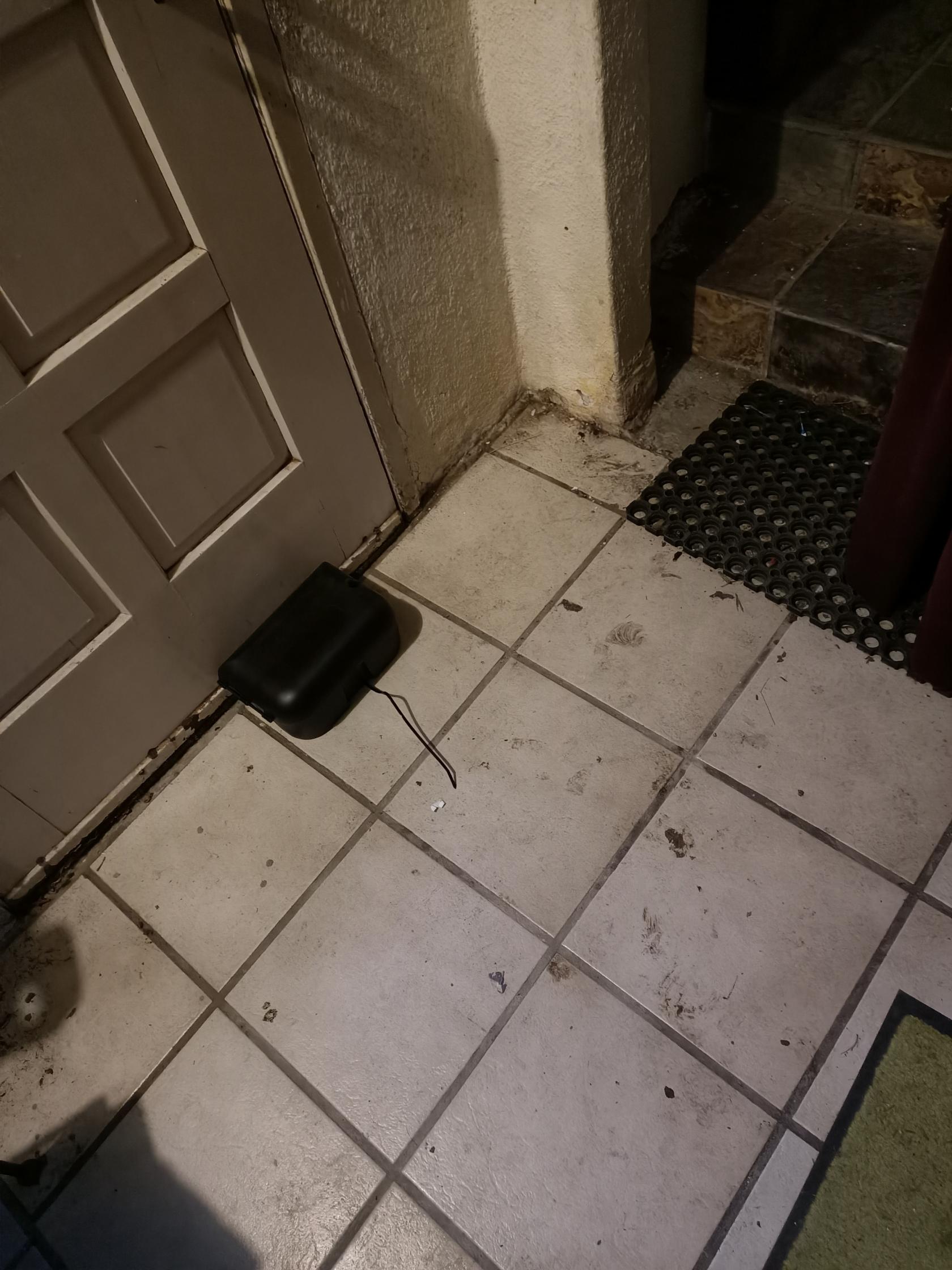 Voor twaalven liet Rat zich niet horen. Pas nadat ik in bed lag hoorde ik weer voetstappen. Stond ik op, werd het weer stil, totdat ik weer in bed lag. In slaap gevallen, 1x naar de wc en bij de 2e keer om 5:19 kijken bij de uitgang. De pot lag nog waar die lag; Rat had de ingang vergroot naar de breedte van de pot en lengte van de schoen. GRMBLLL!