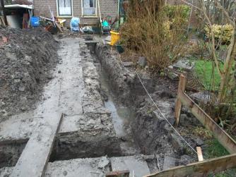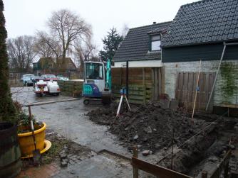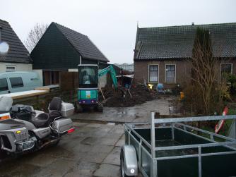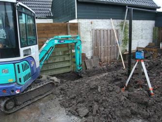 Overbuurman werkte bij een loonbedrijf en die had een minikraantje. Met een zelfnivelerende laserwaterpas de diepte van de sleuf bepaald. Na een uurtje of drie lag er een bult grond op de plaats waar de garage moest komen. De weken daarop bezig geweest om de grond te zuiveren van het meeste puin en te verspreiden in de tuin.