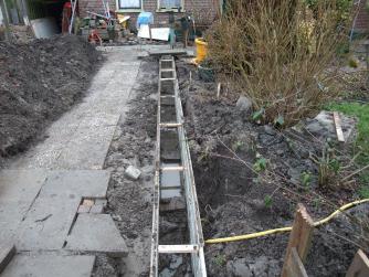 Nou, niet echt. Tijdens het graven van de funderingssleuf kwam ik op archeologische vondsten. Maar weinig bijzonders, het was een oud gewelf van een watertank. Vroeger, toen hier nog alles water was en nauwelijks wegen (alleen een pad onder aan de dijk), hadden de huizen een watertank. Regenwater werd hierin opgevangen en bij droogte werd de tank gevuld met water wat per bootje werd afgeleverd. Zo'n tank had ik ook onder mijn huis. Wat mij wel verbaasde was de plaats van die tank, want bij mijn weten heeft hier nooit een huisje boven gestaan. Buurman had zijn eigen tank. Gauw het gat dichtgegooid, dat zoeken ze over 100 jaar maar weer uit. Naast de sleuf een extra dieper gat gegraven en daar een dompelpomp in gehangen om het grondwater weg te pompen.
