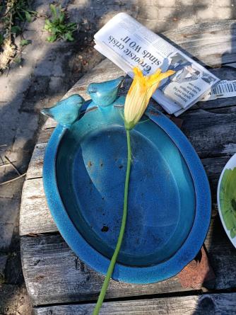 Die bloem die je daar in het vogelbakje ziet is dus mannelijk. De vrouwelijke bloem heeft direct onder de bloem de vrucht zitten. En verder alle uitlopers waar geen vruchten aan zitten en de uitlopers met vrucht een paar blaadjes voorbij de vrucht afknippen.