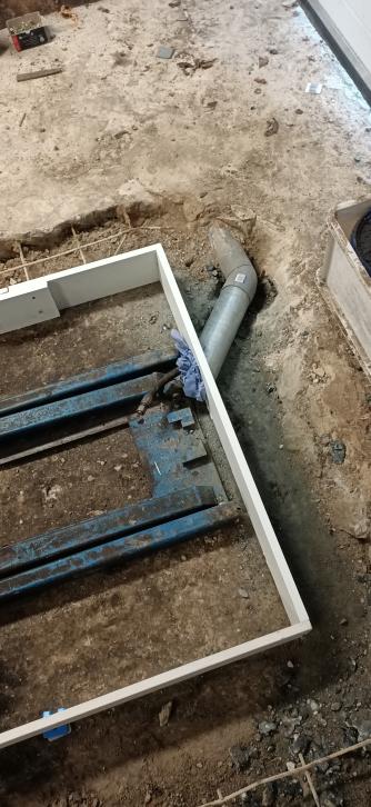 Een kistje gemaakt met broer en op hoogte gesteld, waterpas. Ook de doorvoer voor de olieleiding. Met een zak mortel wat ik nog had het kistje gestabiliseerd door hier en daar een kledder beton in de hoeken te gooien. Als dat hard is, verschuift het kistje niet meer tijdens het aanstorten. Straks de aanhanger legen en beton halen.