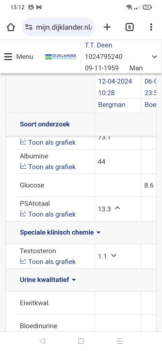 Met recht. Ik had bloed laten prikken voor de belafspraak van maandag. En die stond twee uur later al in mijn dossier bij Dijklander. En ik dacht dat de psa zou doorstijgen van 16,48 naar ergens in de twintig, volgens mijn theorie dat extra testosteron geen negatief effect heeft, als hormoonkuren niet meer voldoende helpen. (Castratieresistent) En nu was de psa juist gedaald, ondanks dat ik een ieniemienie beetje extra testosteron op mijn schouders smeer. De psa ligt nu op 13,3 De oncoloog mag daar maandag duiding aan geven, maar voorlopig lijkt dit experiment nog niet teneinde. Goed weekend!