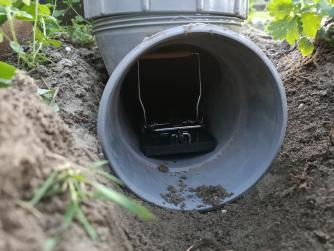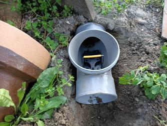 Zoiets heb ik ook voor Rat bedacht. Voor het holletje van de uitgang die ik in de tuin heb gevonden, heb ik een buis ingegraven en een rattenval in de opening op de bodem gezet. De enige manier om nog te ontsnappen is als Rat een aanloop neemt, heel hard gaat rennen tegen de bochten van de wand op en dan de zwaartekracht trotserend via de bovenzijde van de buis de val passeert. De weg terug lukt niet, want daar zit geen buis om vaart in te kunnen maken. Op generlei wijze kan hij voldoende snelheid maken om de buis in omgekeerde richting opnieuw binnen te gaan. Is dat even slim!