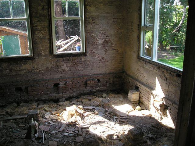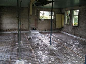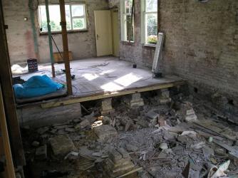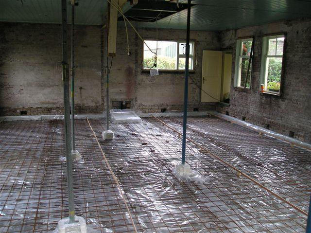 Vroeger lag er een houten vloer op balken binnen de muren, maar ik heb de vloer eruit gehaald omdat ik vloerverwarming wilde. Er is tussen de muren een betonnen werkvloer van 10 cm dik gestort. Die vloer is zo zwaar, die mag niet aan de oude muren van het huis worden vastgestort. Dat zou een bijzonder risico van verzakkingen en scheuren kunnen opleveren. Daarom is er eerst een strook piepschuim van twee centimeter dikte eerst tegen de muur geplaats en daar is die vloer tegenaan gestort, zodat deze vrij van de muren kan verzakken.