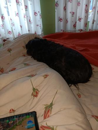 En de eerste vijfhonderd meter, dan is Boef een sleephond. De rolriem tot het uiterste afgerold en Boef op sleeptouw. Vermoeiend voor Zweef. De tweede vijfhonderd meter lopen Boef en Zweef samen op. Boef eerst nog een beetje achterop, maar gaandeweg iets vooruit. En dan moet Zweef een stapje extra doen om Boef bij te houden. Daar wordt Zweef best wel kortademig van. De laatste vijfhonderd meter gaat Boef weer aan de lijn, want dan kan Zweef Boef niet meer bijhouden en wordt dan weer een sleephond met de rolriem tot het uiterste uitgerold, maar nu naar voren.