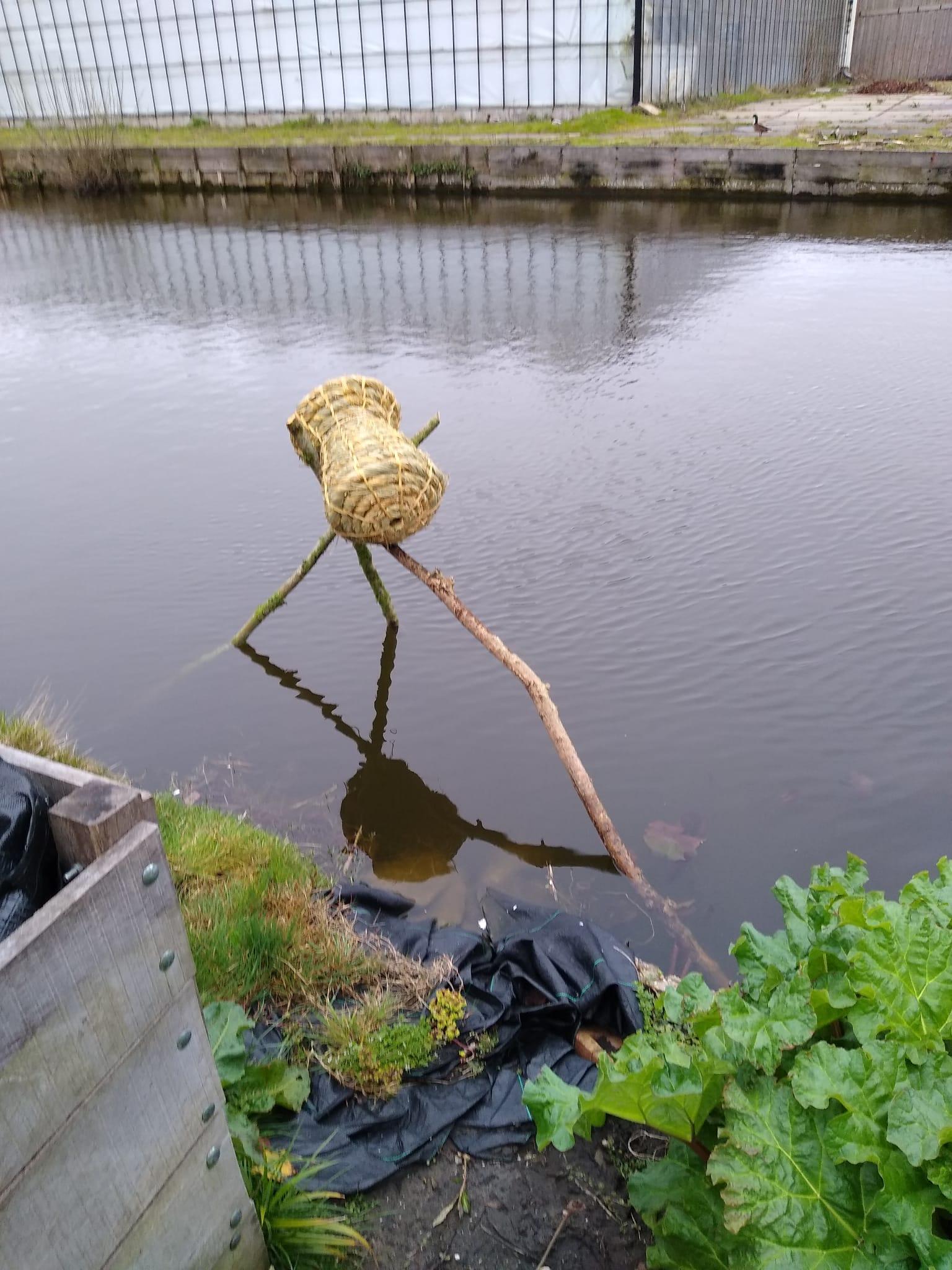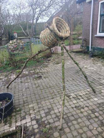Mevrouw Zweef had gisteren een eendenkorf gekocht met Fryske gebruiksaanwijzing. Nu woon ik in het Westfriese, dus na een paar keer lezen begreep ik de strekking. Mevrouw Zweef wist nog een paar redelijk lange takken in het bosje van vakantiepark Het Grootslag en daarvan heb ik een driepoot gemaakt voor in de sloot. Riet uit de slootkant gesneden als nestmateriaal, anders wonen de eenden zo'n woning uit en slopen ze alle (binnen)wanden eruit. Mevrouw Zweef is van het bedden opmaken en die heeft hun eendenbedje gespreid. En daarna moest de driepoot in de sloot.