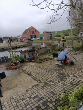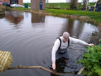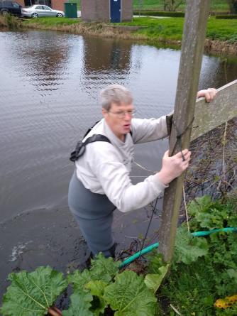 De sloot was dieper dan ik dacht. En de bodem ook veel zachter. En ik stond tot bijna mijn borst in de blubbersloot. Maar de korf staat. En het water stond ook. Even hoog in mijn pak als erbuiten. Gauw onder de hete douche en bij het warme kacheltje.