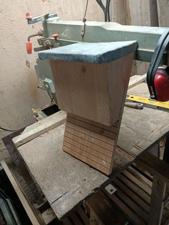 En daarvoor moest ik eerst het vleermuishuisje aan de kant leggen die ik nog niet had opgehangen omdat er geen bescherming op het dakje zat. Hout wordt dan nat en gaat verweren. Nu had ik nog een stukje lood, maar dat lag onder de afkortzaag, onder het zaagsel. Dus eerst dat maar opgeruimd. Toen het dakje gemaakt en de ladder tegen de boom.