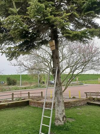 Bij de eerste voet op de ladder zakte de poot in een mollengang. Vast wraak van de geest van Mol. Ladder met een spanbandje vastgezet en het huisje voor Floor uit Vledder vastgeschroefd. Jullie dachten toch niet dat Floor altijd bij zijn ouders bleef wonen??