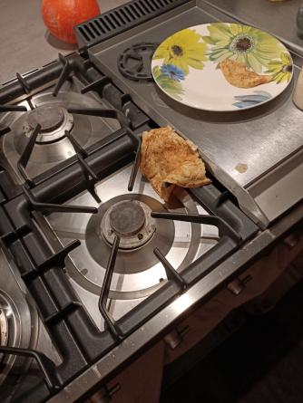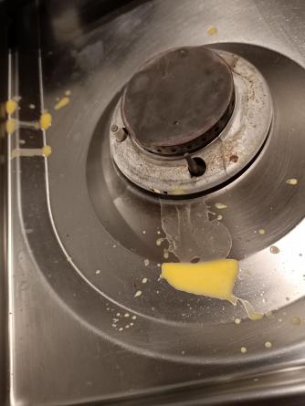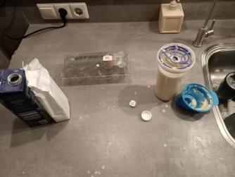 Waar slagroom zich bij het schudden goed gedraagt en niet in volume toeneemt, lag dat bij pannekoekenmeel anders. De beker was aardig vol, want waar een vol pak de exacte mengverhouding aangeeft, was ik die nu een beetje kwijt. En het ei doet kennelijk wat met het meel. Na al enkele schudbewegingen paste het beslag niet meer in de shaker en hoewel ik het deksel links en rechts van het tuutje vasthield, perste zich een stroom van pannekoekenmeel-met-kaneel langs het deksel en verspreidde zich in grote druppels over het aanrechtblad, keukenraam en Zweef. Op dat moment had ik bij zinnen moeten komen en een tosti uit de vriezer moeten halen. Mijn onhandigheid was niet tot deze actie begrensd.