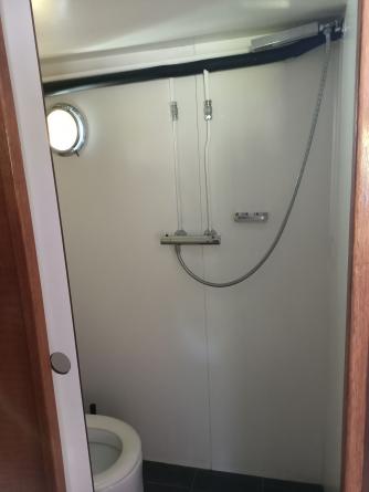 De twijfel boven dit stuk slaat niet op mijn behandeltraject, edoch op de grootte van het bed in de kapiteinskamer. De grootste tweepersoonskamer met douche en toilet op de kamer. Want wij gaan voor luxe! Het bed is een twijfelaar, zowel in de breedte als in de lengte. Dat is met mijn 1,91 m een uitdaging. Overdwars lukt net. Als enige kamer heeft deze kamer douche en toilet op de kamer. Niet zo luxe als thuis, maar soit! Maar een douche zoals op de foto hieronder in de wc, is wel erg basic. Gelukkig wel warm water. Offe....eigenlijk te warm. Bloedverziekend heet zelfs en niet te regelen. Misschien ooit wel, maar nu niet meer. We hebben ter plekke besloten om als we ons te vies voelen, we dan naar vrienden in Swalmen gaan om te douchen.