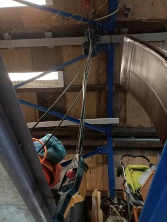 Gelukkig heb ik een takeltje in de nok van de garage aan een loopkat. En een luik in de zoldervloer. Allemaal gemaakt toen ik nog geen kankerlijer van nature was. Dus de motor naar het luik gemanoeuvreerd, takeltje naar beneden en met twee hijsbandjes de kont omhoog. Starten, warmdraaien, in de versnelling (achterwiel draaide), beetje gas bij en toen de achterrem intrappen. Koppeling sputterde tegen, maar moest in mij zijn meerdere erkennen.