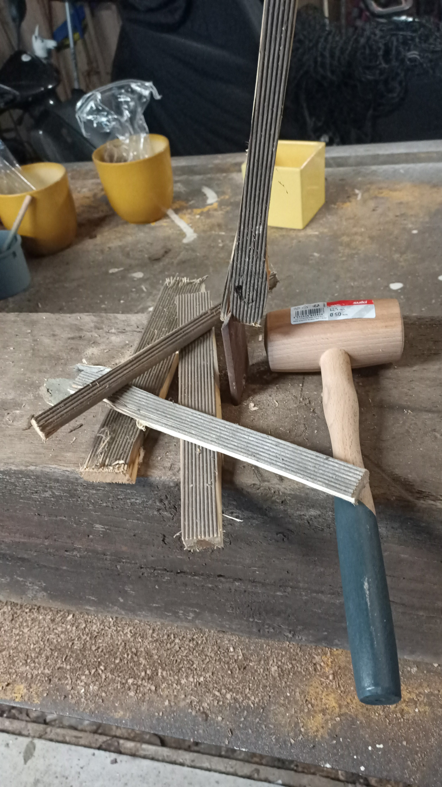 Mevrouw Zweef had een tip gezien om een houten bijl tussen houtschroeven vast te zetten om dan met een hamer aanmaakhoutjes te hakken. Zweef weet wat beters.