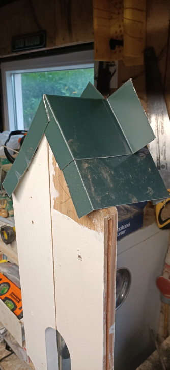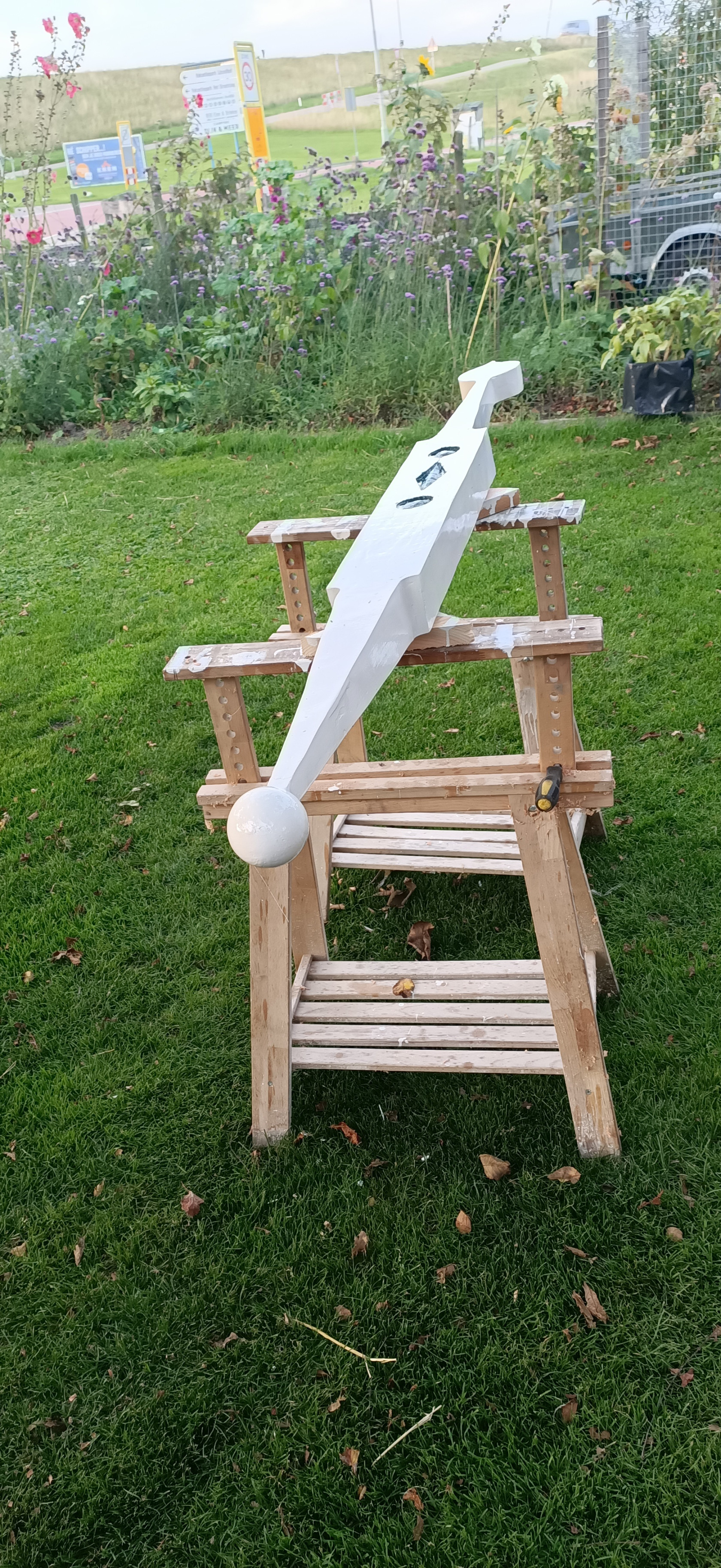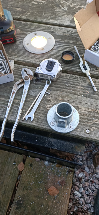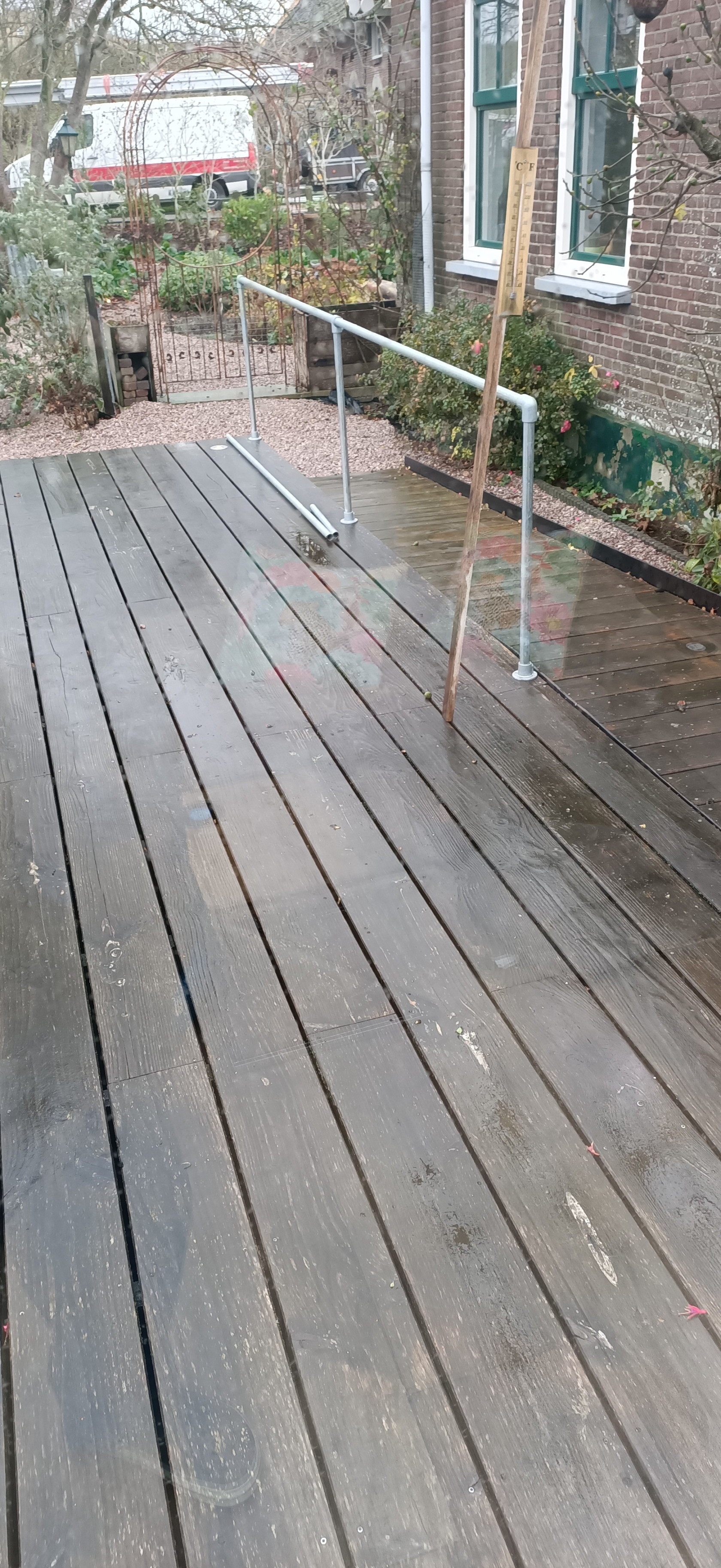 De dakrand achter is vervangen en ziet er gelikt uit. Als laatste heb ik het afdekkapje gemaakt voor bovenop bij de makelaar. Een railing gemaakt langs de randen van het verhoogde terras, ook fijn bij de hellingbaan als het hout nat is. De voetstukken moesten worden vastgezet aan de stalen liggers onder het terras, deels boutje moertje, deels door schroefdraad te tappen.