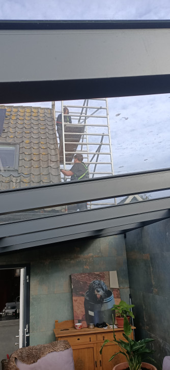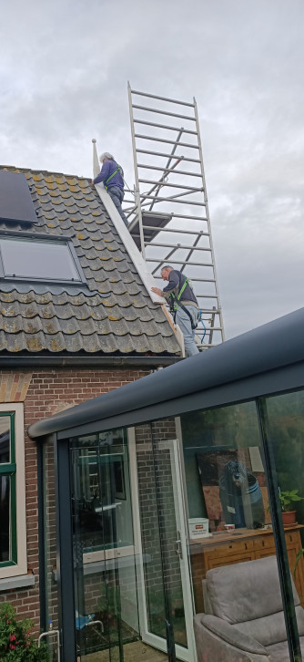 Ik ben enorm blij met mijn oudste broer voor zijn hulp, zijn kennis en kracht, ondanks zijn krakkemikkige knie gaat hij toch maar de steiger op om de dakrand aan de achterkant te monteren. En ook hartstikke blij met de "sloopploeg" van jongste broer die drie man sterk ingetuigd de steiger op gingen om de oude dakrand te slopen. Wat waren die zelf ook gesloopt eind van de dag. Op zo'n steiger gebruik je heel andere spieren dan op je telefoon 😂.
